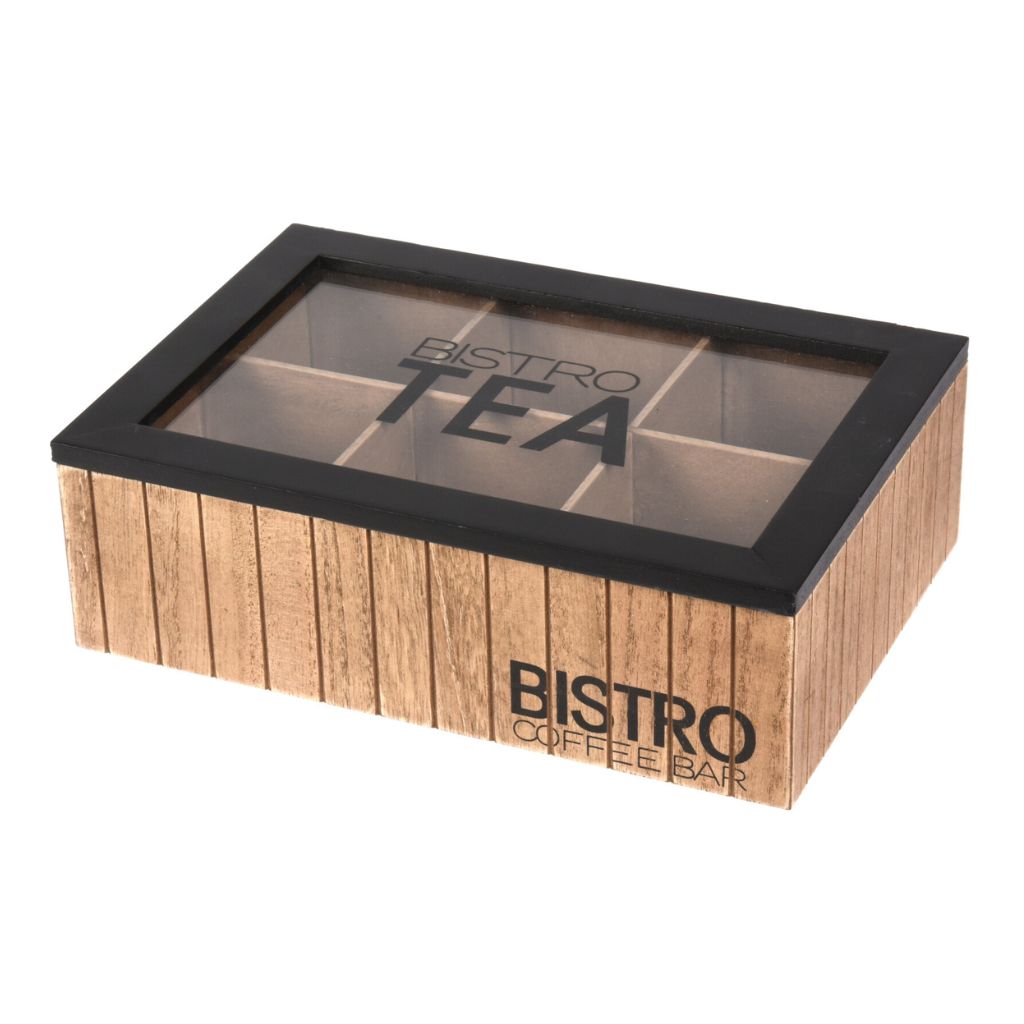 A teadoboz teafilterekhez praktikus és dekoratív megoldás a kedvenc teák rendszerezésére. Hat elkülönített rekesze átláthatóvá teszi a készletet: külön tárolhatók a fekete, zöld, fehér és gyümölcsös teák, illetve a koffeinmentes és gyógynövényes variációk. A natúr fa hatású korpusz otthonos érzetet ad, a fekete kerettel szegélyezett üveg fedél pedig modern, „Bistro” hangulatot kölcsönöz a konyhapultnak vagy irodai teakonyhának.